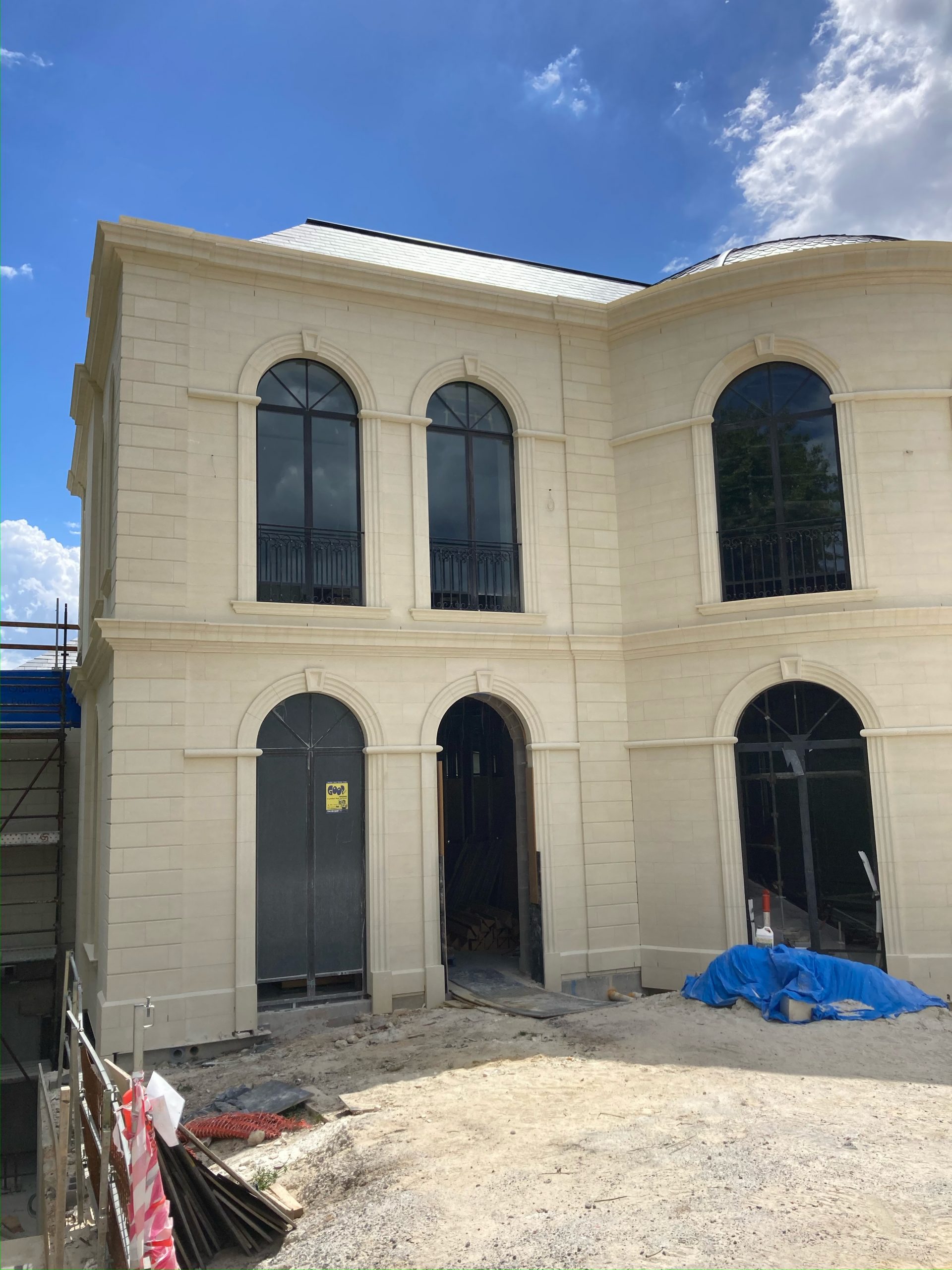 We have organised to have every piece of stone carved on-site to create the arched shape at the front entrance. Inside, the house has a magnificent sense of height, with 5 meter-tall ceilings, only adding to the colossal nature of this design.